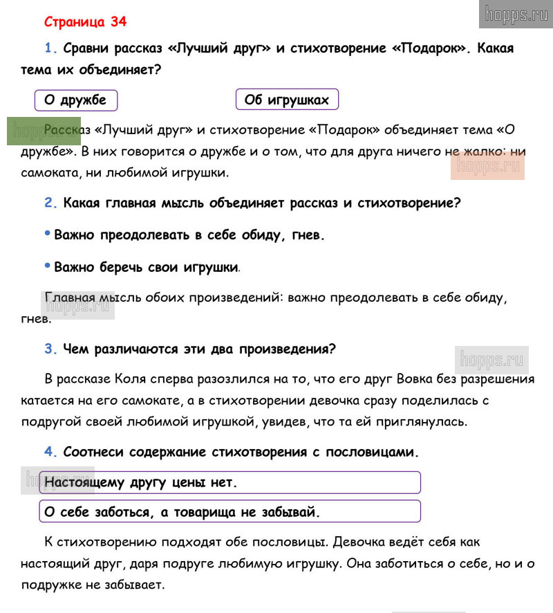 Готовые ответы к вопросам и заданиям на 34 странице 2 части учебнику по литературному чтению для учащихся 1 класса, авторов Л.Ф. Климанова, В.Г. Горецкий, М.В. Голованова, Школа России, 2019 г.