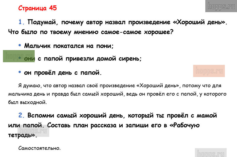 Готовые ответы к вопросам и заданиям на 45 странице 2 части учебнику по литературному чтению для учащихся 1 класса, авторов Л.Ф. Климанова, В.Г. Горецкий, М.В. Голованова, Школа России, 2019 г.