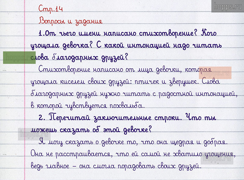Подробные ответы к вопросам, расположенным на 14 странице 2 части учебника 2011 года по литературному чтению авторов Л.Ф. Климанова, В.Г. Горецкий, Л.А. Виноградская для учащихся 1 класса.