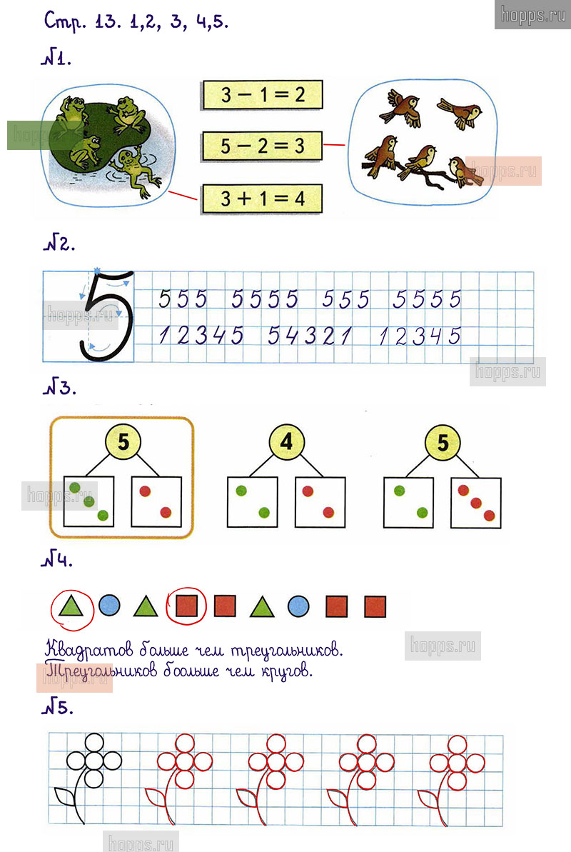 Подробные ответы к заданиям, расположенным на 13 странице 1 части рабочей тетради по математике авторов М.И. Моро, С.И. Волкова для учащихся 1 класса.
