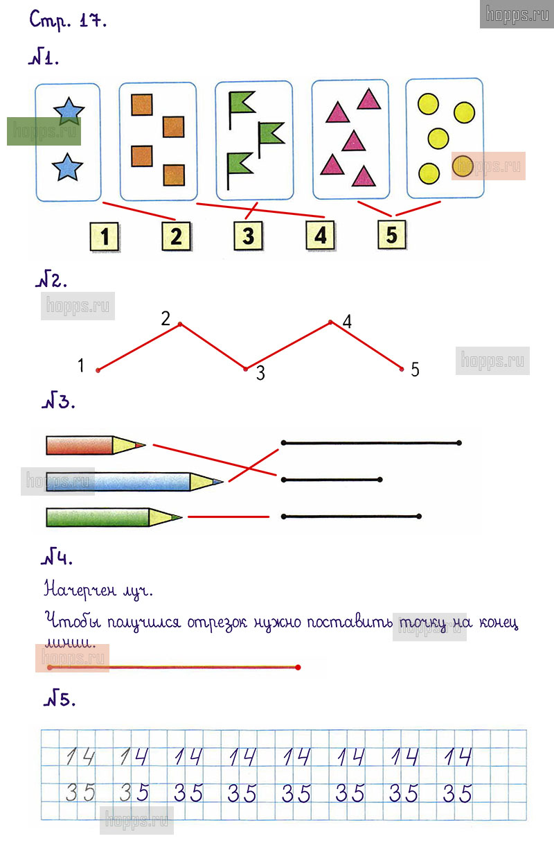 Подробные ответы к заданиям, расположенным на 17 странице 1 части рабочей тетради по математике авторов М.И. Моро, С.И. Волкова для учащихся 1 класса.