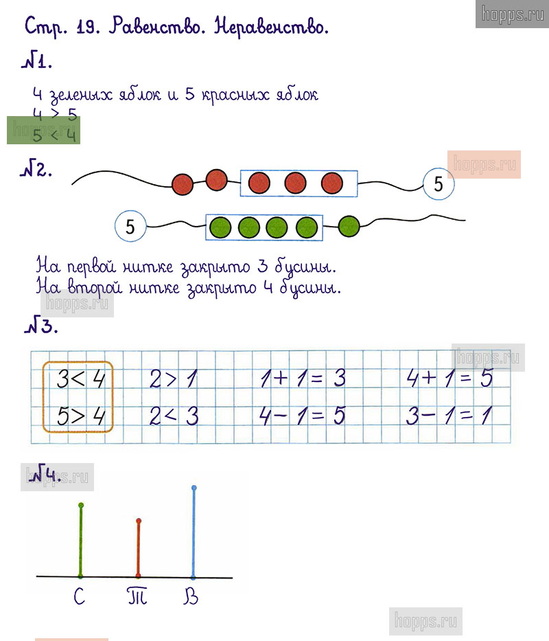 Подробные ответы к заданиям, расположенным на 19 странице 1 части рабочей тетради по математике авторов М.И. Моро, С.И. Волкова для учащихся 1 класса.