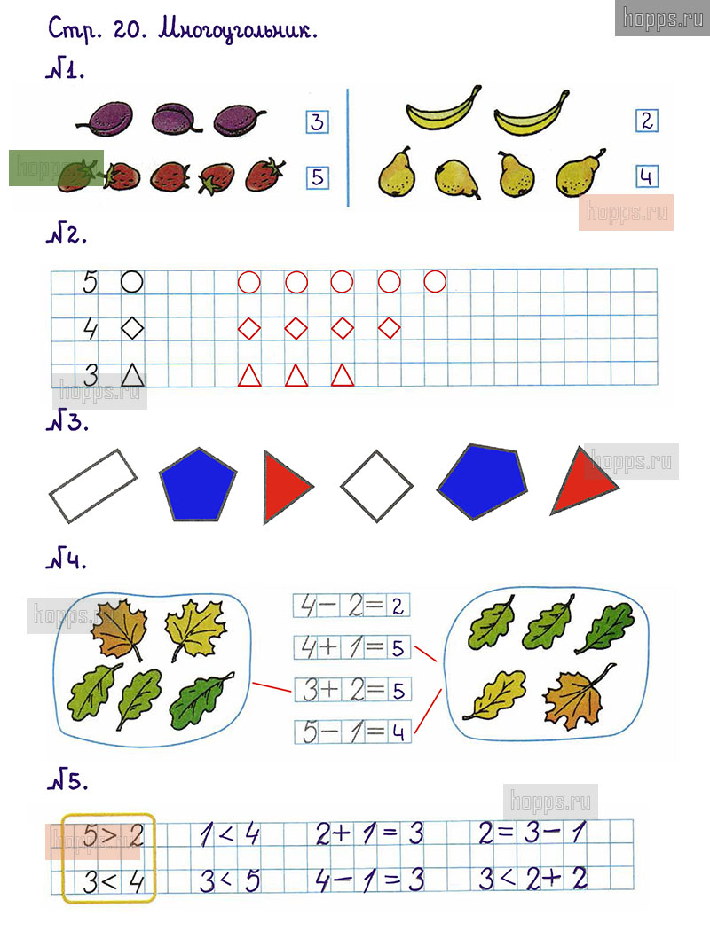 Подробные ответы к заданиям, расположенным на 20 странице 1 части рабочей тетради по математике авторов М.И. Моро, С.И. Волкова для учащихся 1 класса.