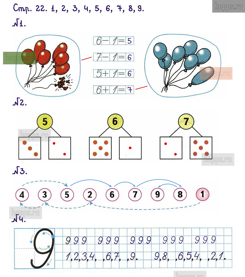Подробные ответы к заданиям, расположенным на 22 странице 1 части рабочей тетради по математике авторов М.И. Моро, С.И. Волкова для учащихся 1 класса.