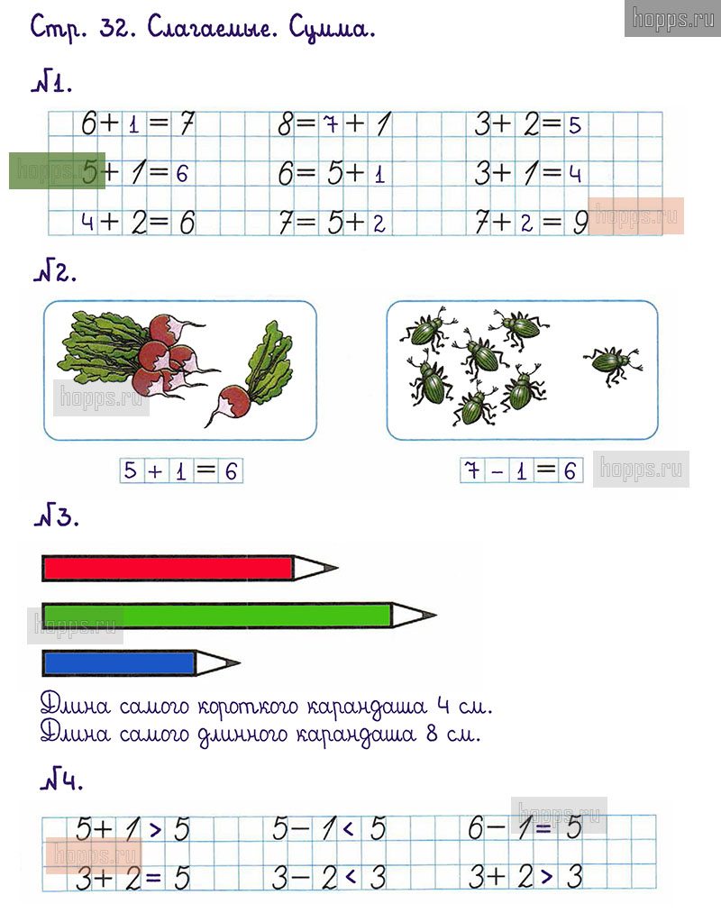 Подробные ответы к заданиям, расположенным на 32 странице 1 части рабочей тетради по математике авторов М.И. Моро, С.И. Волкова для учащихся 1 класса.