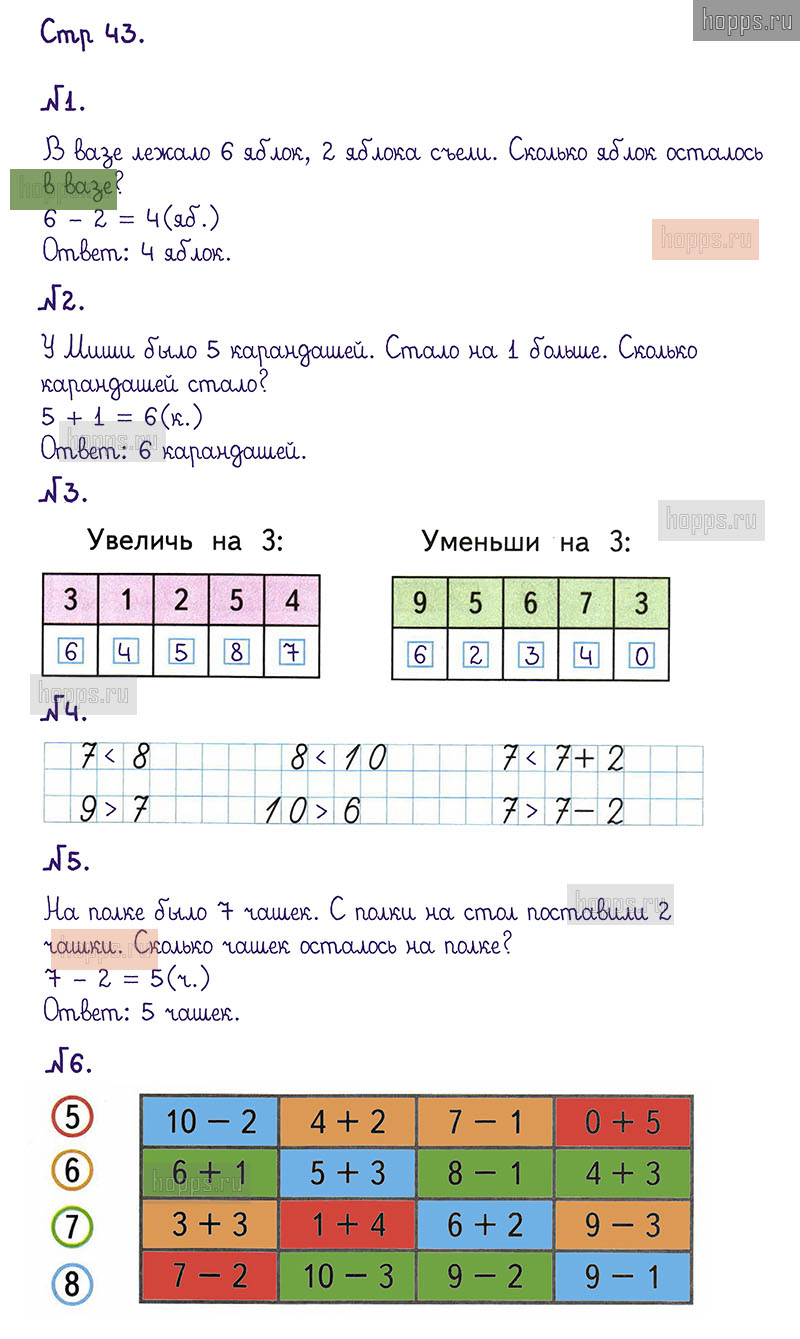 Подробные ответы к заданиям, расположенным на 43 странице 1 части рабочей тетради по математике авторов М.И. Моро, С.И. Волкова для учащихся 1 класса.