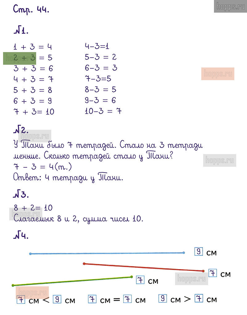 Подробные ответы к заданиям, расположенным на 44 странице 1 части рабочей тетради по математике авторов М.И. Моро, С.И. Волкова для учащихся 1 класса.