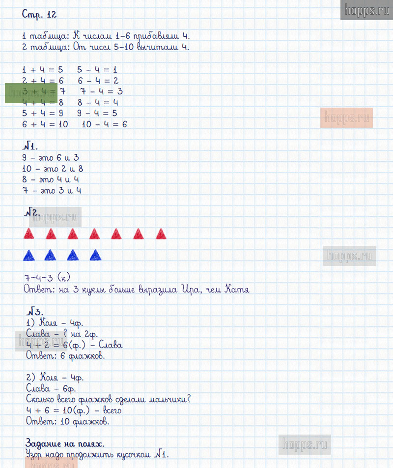 Подробные ответы к заданиям, расположенным на 12 странице 2 части рабочей тетради по математике авторов М.И. Моро, С.И. Волкова для учащихся 1 класса.
