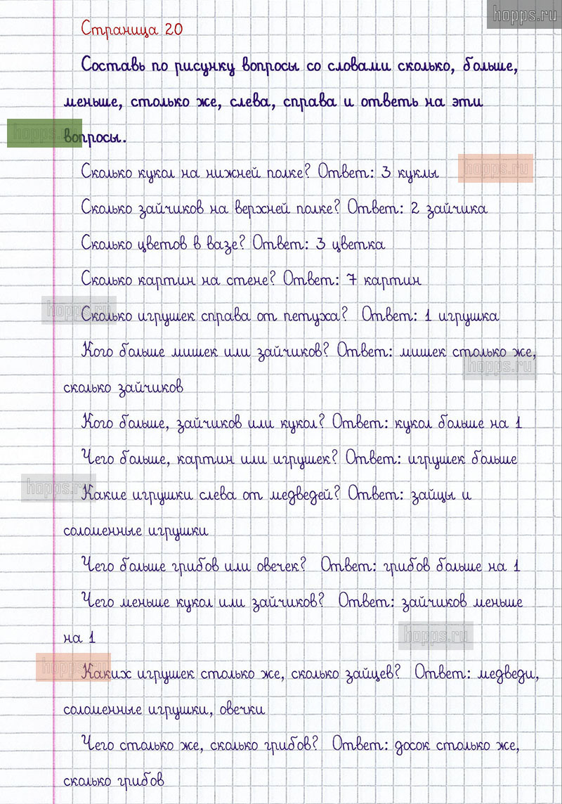 Подробные ответы к заданиям, расположенным на 20 странице 1 части учебника по математике авторов М.И. Моро, С.И. Волкова, С.В. Степанова для учащихся 1 класса.
