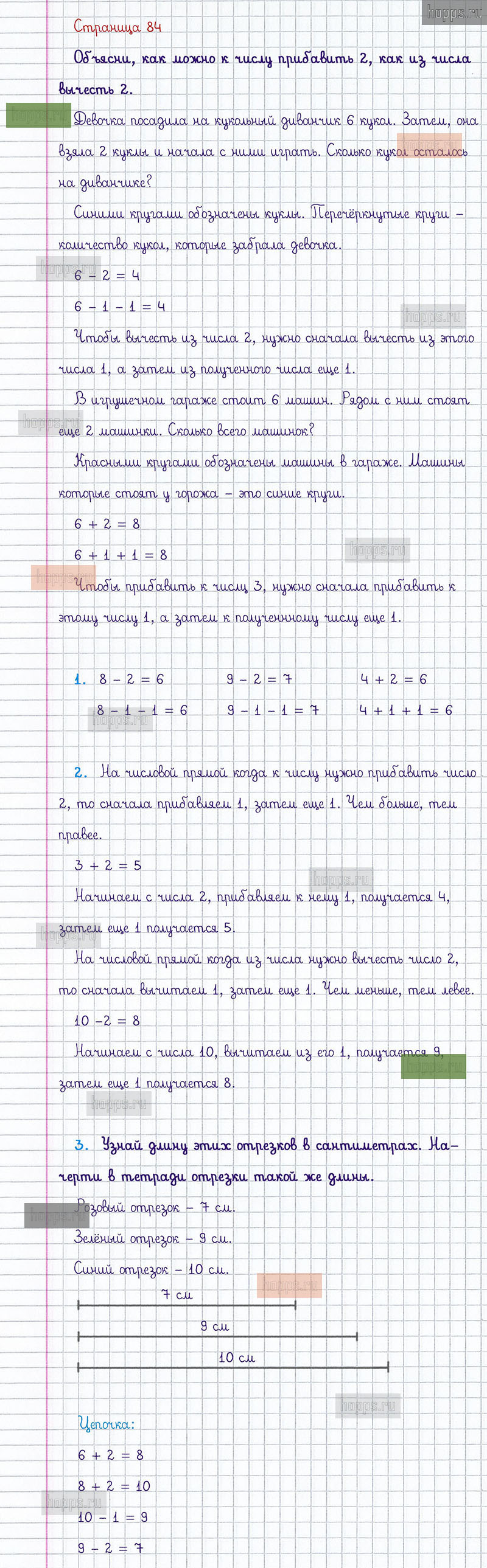 Подробные ответы к заданиям, расположенным на 84 странице 1 части учебника по математике авторов М.И. Моро, С.И. Волкова, С.В. Степанова для учащихся 1 класса.