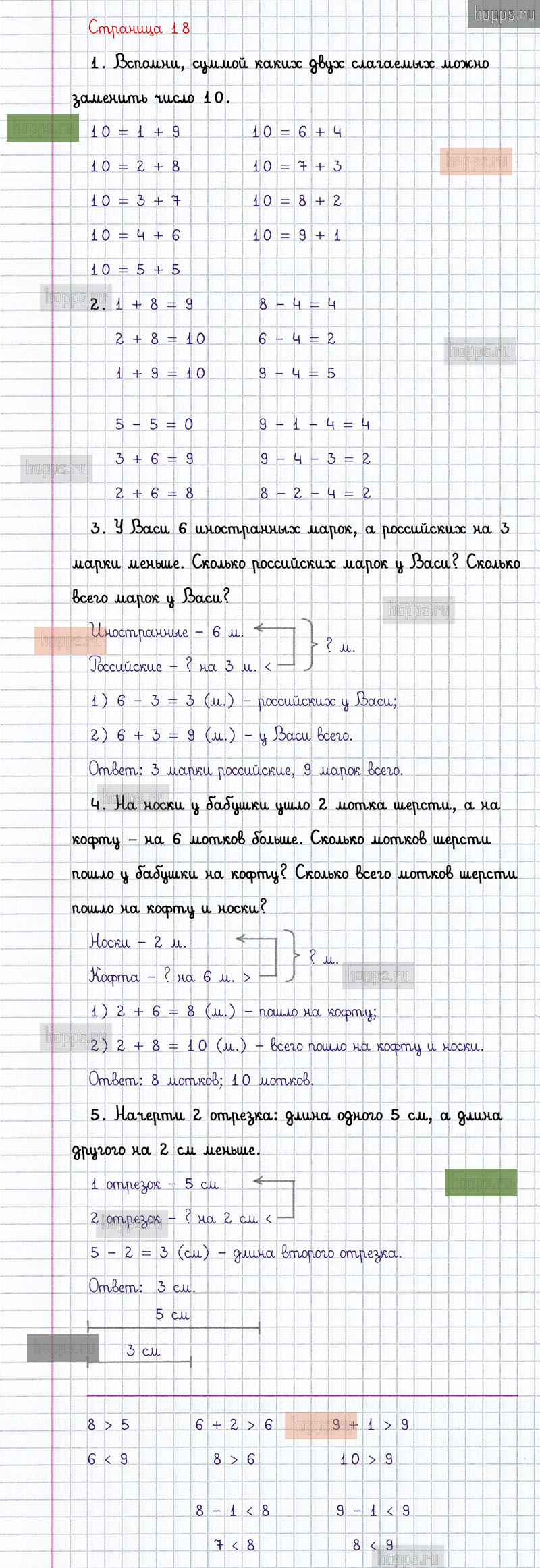 Подробные ответы к заданиям, расположенным на 18 странице 2 части учебника по математике авторов М.И. Моро, С.И. Волкова, С.В. Степанова для учащихся 1 класса.