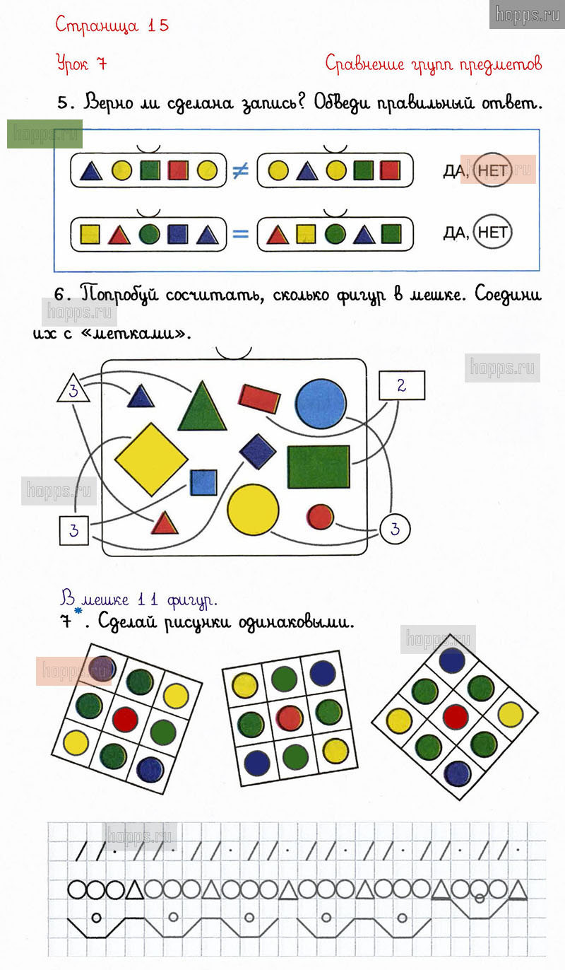 Подробные ответы к заданиям на 15 странице 1 части рабочей тетради по математике автора Л. Г. Петерсон для учащихся 1 класса. Урок 7. Сравнение групп предметов.