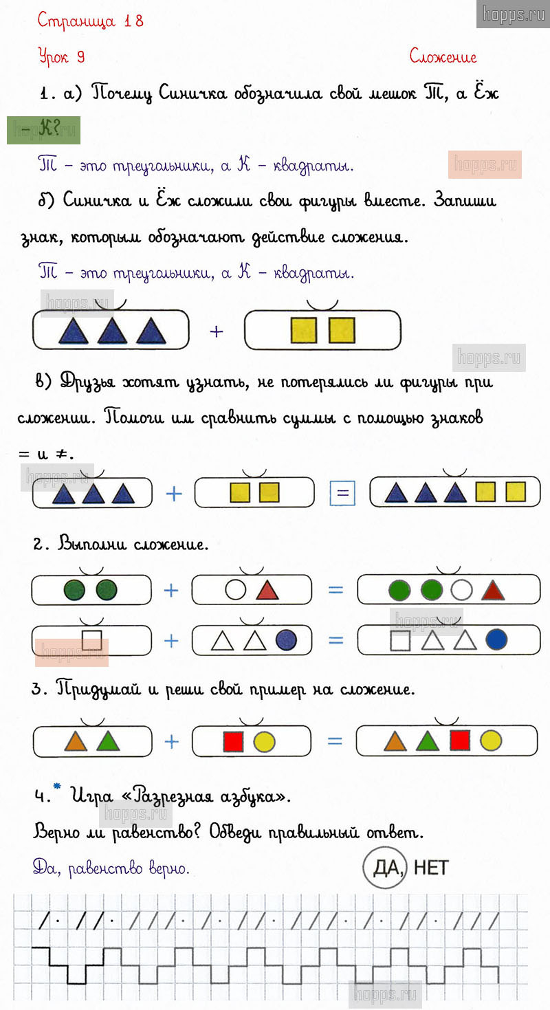 Подробные ответы к заданиям на 18 странице 1 части рабочей тетради по математике автора Л. Г. Петерсон для учащихся 1 класса. Урок 9. Сложение.
