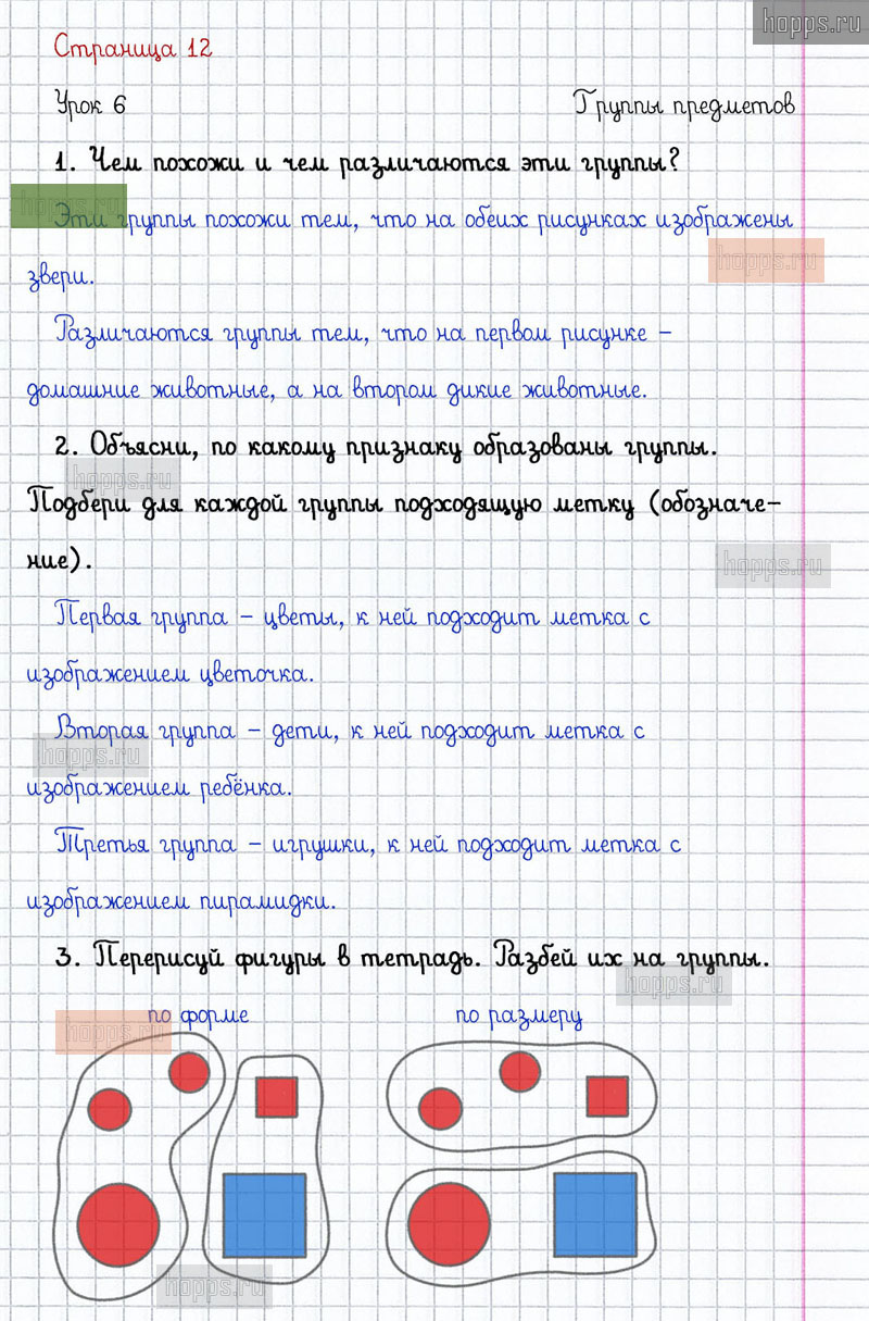 Подробные ответы к заданиям на 12 странице 1 части учебника по математике автора Л.Г. Петерсон для учащихся 1 класса. Урок 6. Группы предметов.