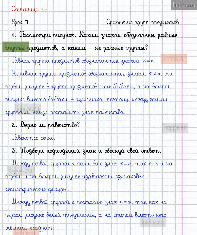 Подробные ответы к заданиям на 14 странице 1 части учебника по математике автора Л.Г. Петерсон для учащихся 1 класса. Урок 7. Сравнение групп предметов.