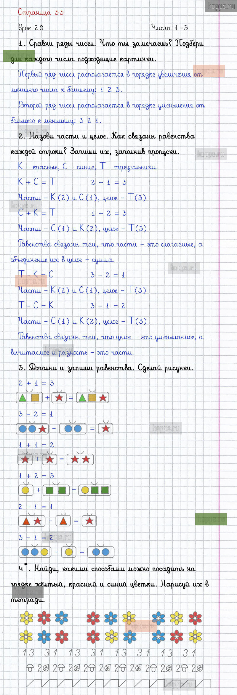 Подробные ответы к заданиям на 33 странице 1 части учебника по математике автора Л.Г. Петерсон для учащихся 1 класса. Урок 20. Числа 1-3.