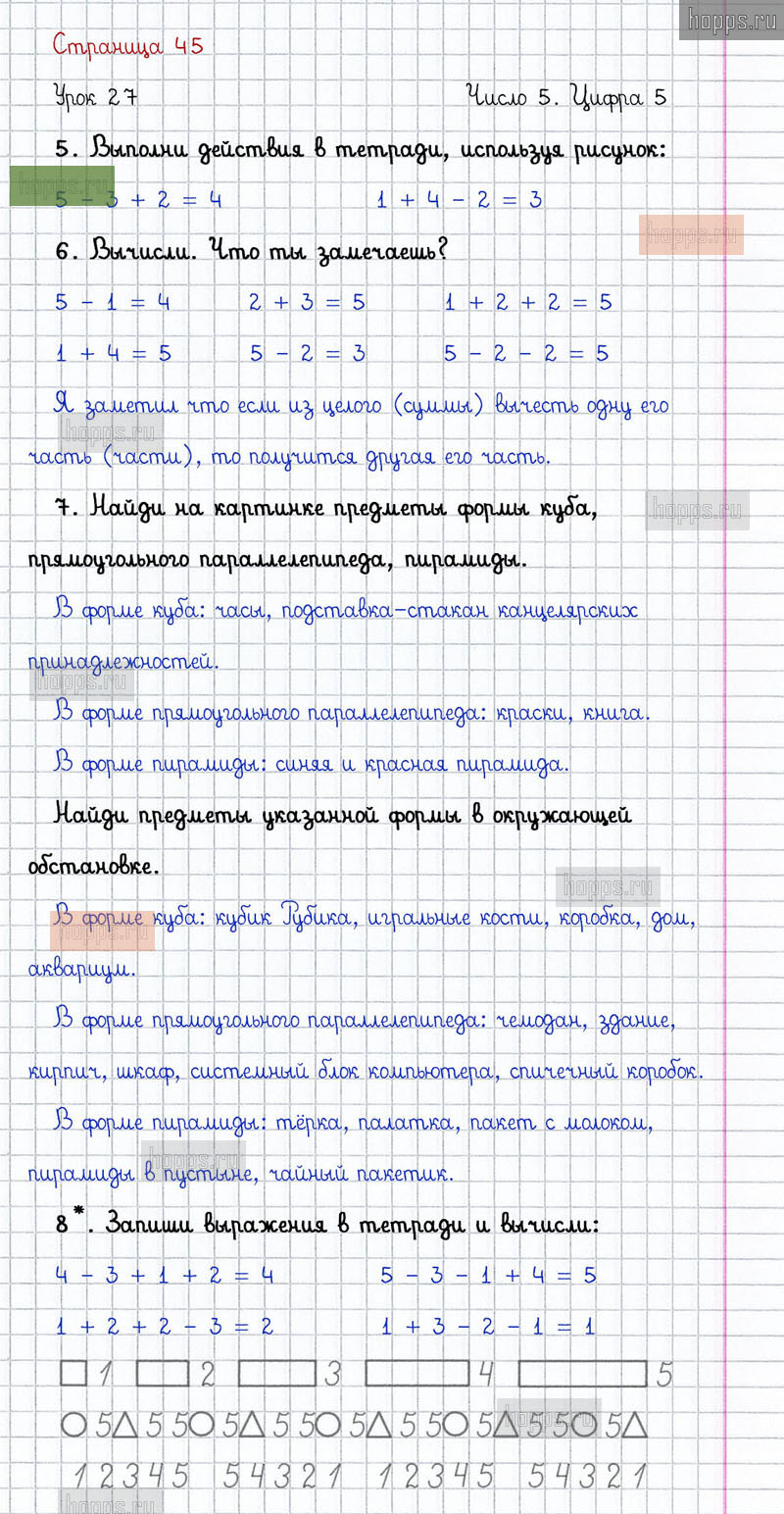 Подробные ответы к заданиям на 45 странице 1 части учебника по математике автора Л.Г. Петерсон для учащихся 1 класса. Урок 27. Число 5. Цифра 5.