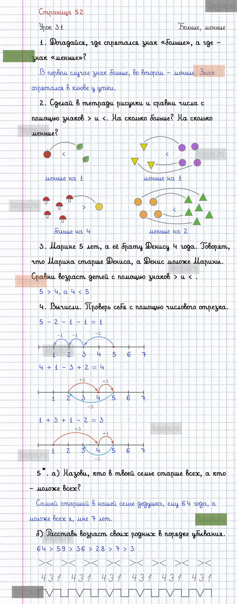 Подробные ответы к заданиям на 52 странице 1 части учебника по математике автора Л.Г. Петерсон для учащихся 1 класса. Урок 31. Больше, меньше.
