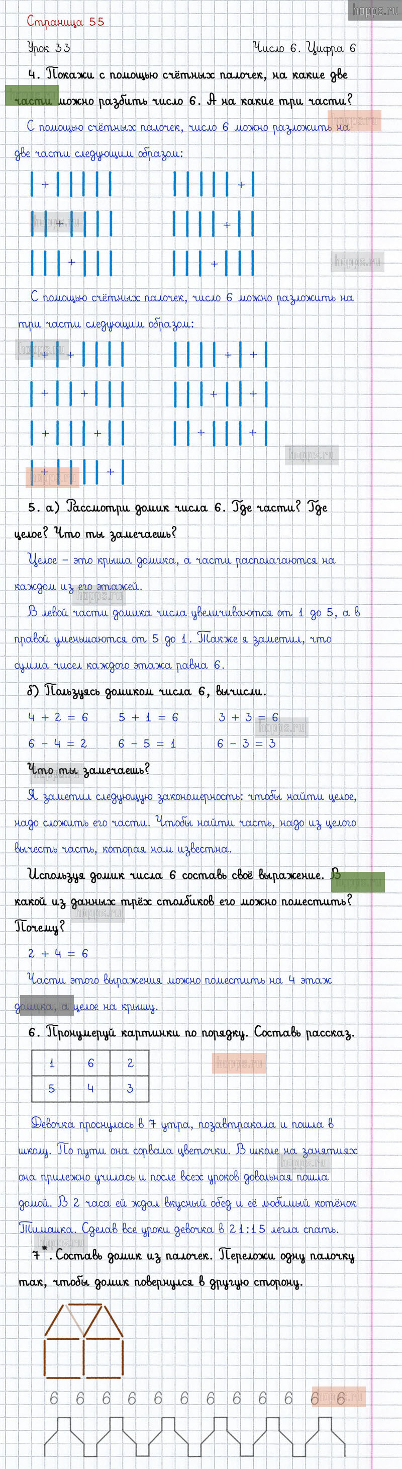 Подробные ответы к заданиям на 55 странице 1 части учебника по математике автора Л.Г. Петерсон для учащихся 1 класса. Урок 33. Число 6. Цифра 6.