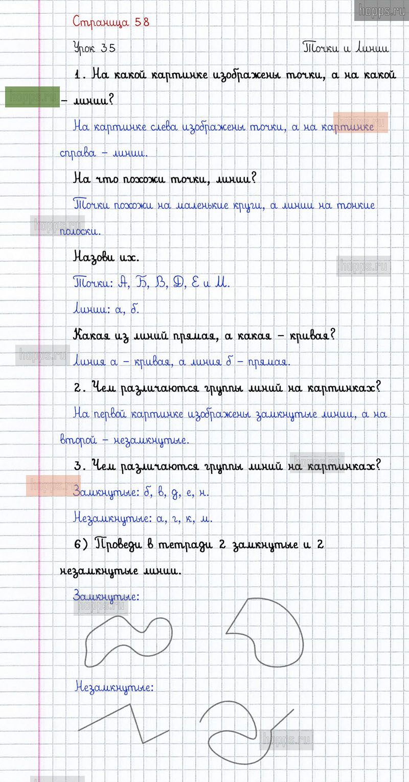 Подробные ответы к заданиям на 58 странице 1 части учебника по математике автора Л.Г. Петерсон для учащихся 1 класса. Урок 35. Точки и линии.