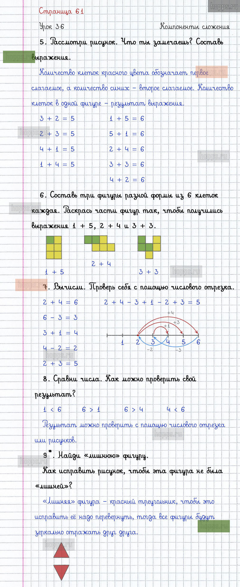 Подробные ответы к заданиям на 61 странице 1 части учебника по математике автора Л.Г. Петерсон для учащихся 1 класса. Урок 36. Компоненты сложения.