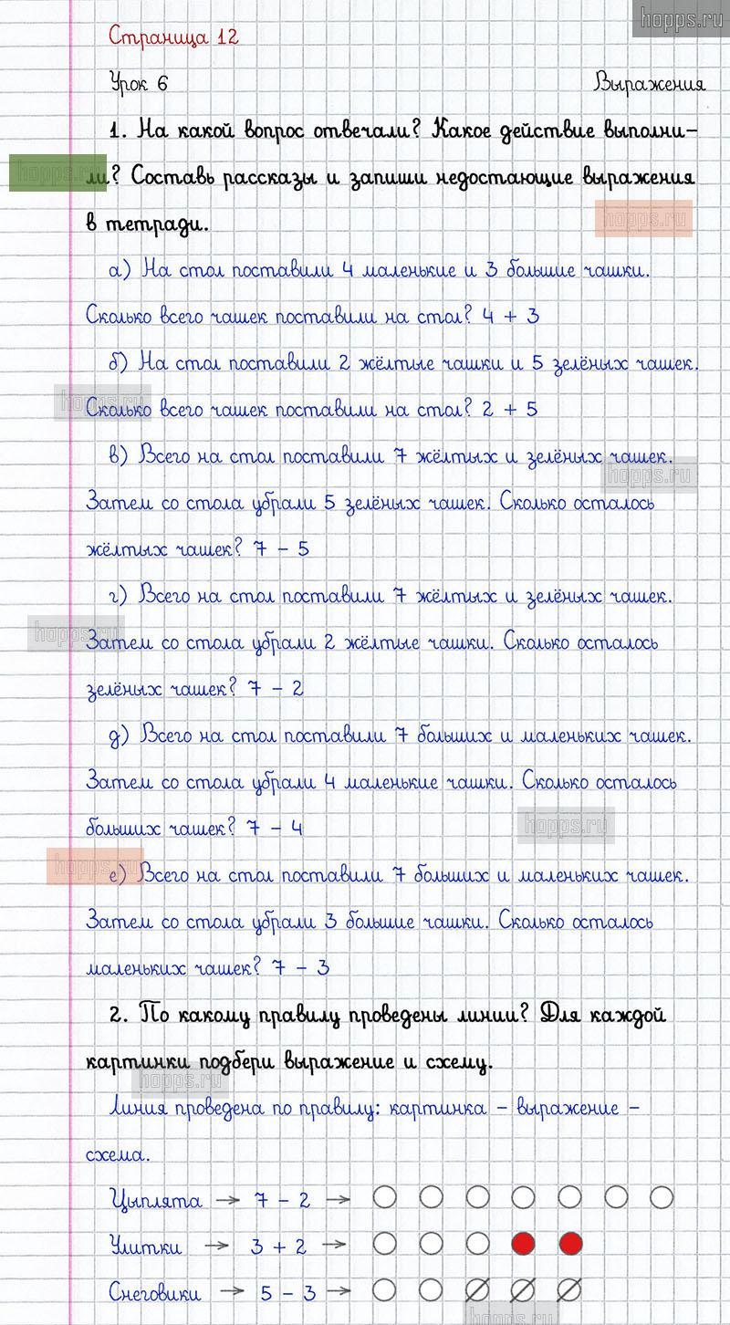 Подробные ответы к заданиям на 12 странице 2 части учебника по математике автора Л.Г. Петерсон для учащихся 1 класса. Урок 6. Выражения.
