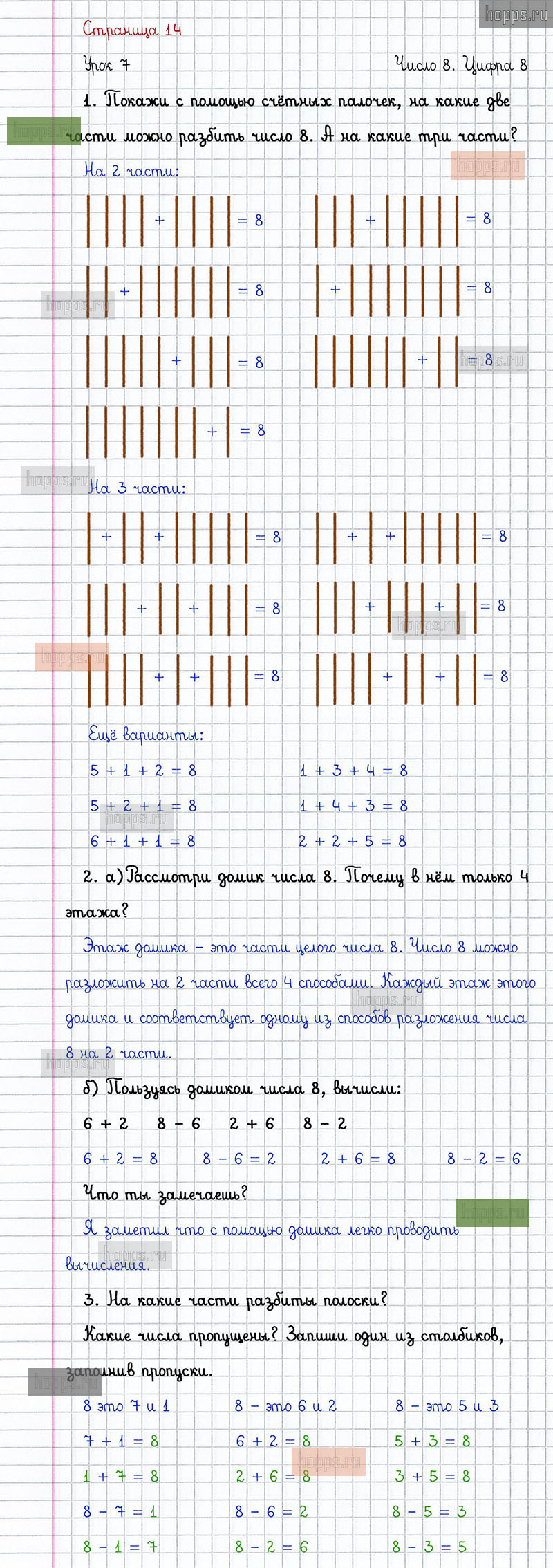 Подробные ответы к заданиям на 14 странице 2 части учебника по математике автора Л.Г. Петерсон для учащихся 1 класса. Урок 7. Число 8. Цифра 8.