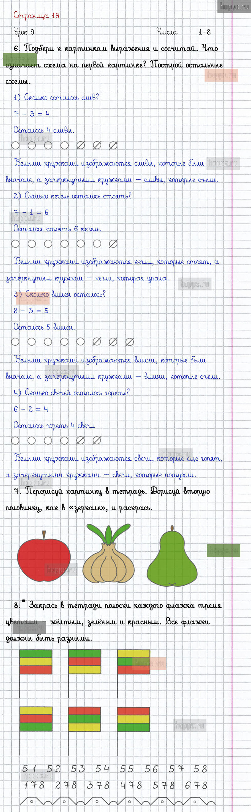 Подробные ответы к заданиям на 19 странице 2 части учебника по математике автора Л.Г. Петерсон для учащихся 1 класса. Урок 9. Числа 1 - 8.