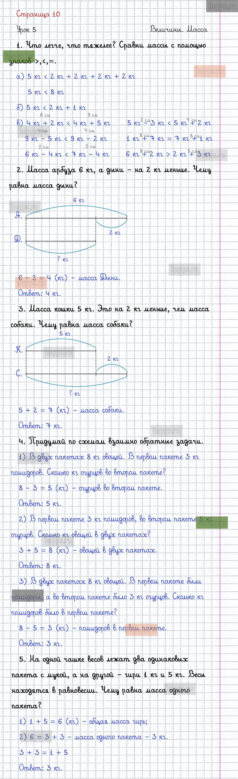 Подробные ответы к заданиям на 10 странице 3 части учебника по математике автора Л.Г. Петерсон для учащихся 1 класса. Урок 5. Величины. Масса.