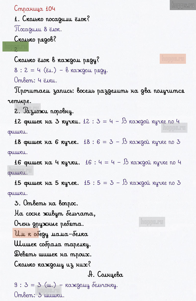 Подробные ответы к заданиям на 104 странице 1 части учебника по математике авторов В. Н. Рудницкая, Е. Э. Кочурова, О. А. Рыдзе для учащихся 1 класса. Урок 46. Делим числа.