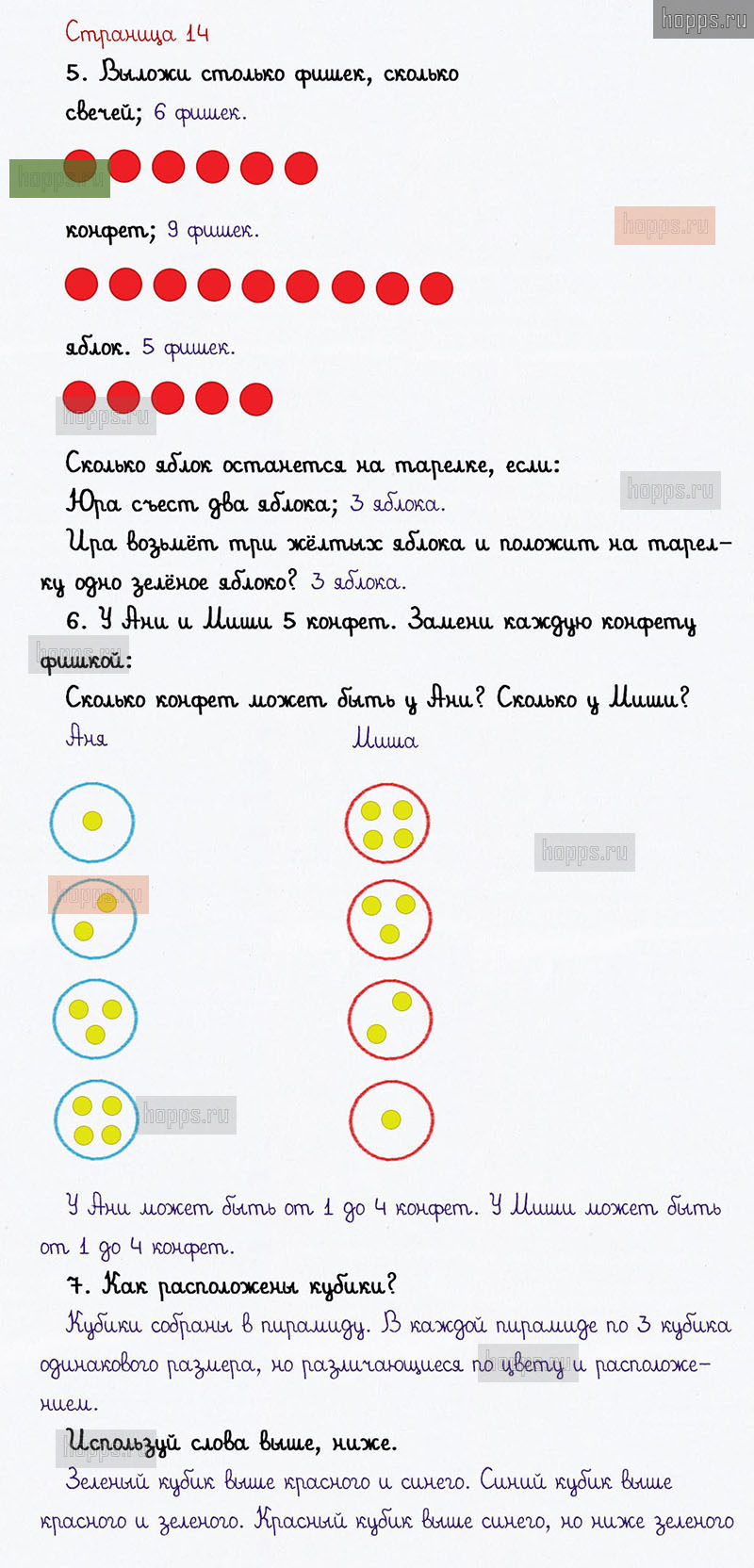 Подробные ответы к заданиям на 14 странице 1 части учебника по математике авторов В. Н. Рудницкая, Е. Э. Кочурова, О. А. Рыдзе для учащихся 1 класса. Урок 5. Сравниваем.