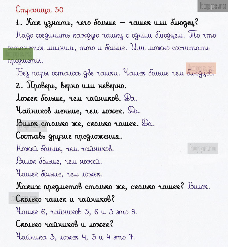 Подробные ответы к заданиям на 30 странице 1 части учебника по математике авторов В. Н. Рудницкая, Е. Э. Кочурова, О. А. Рыдзе для учащихся 1 класса. Урок 13. Сравниваем.