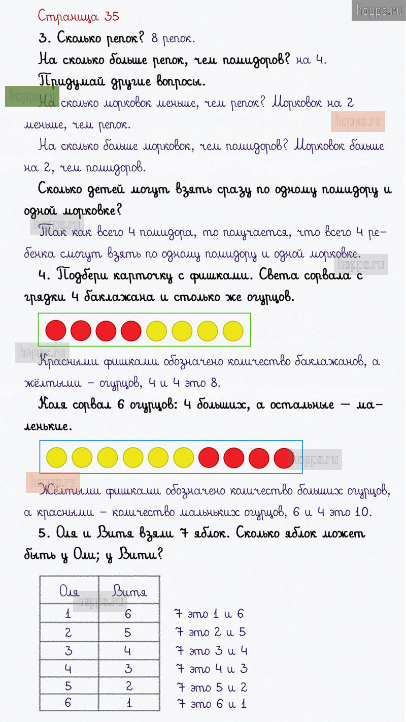 Подробные ответы к заданиям на 35 странице 1 части учебника по математике авторов В. Н. Рудницкая, Е. Э. Кочурова, О. А. Рыдзе для учащихся 1 класса. Урок 14. Сравниваем.