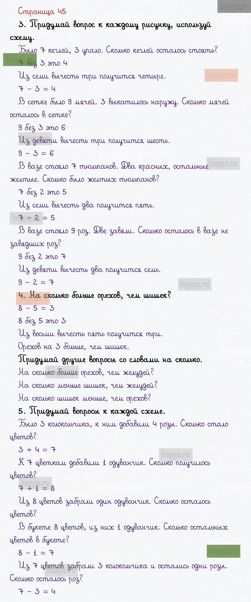 Подробные ответы к заданиям на 45 странице 1 части учебника по математике авторов В. Н. Рудницкая, Е. Э. Кочурова, О. А. Рыдзе для учащихся 1 класса. Урок 18. Вычитаем числа.