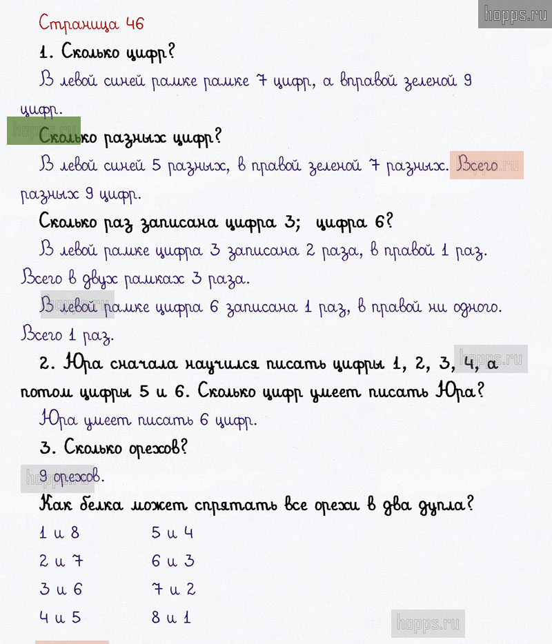 Подробные ответы к заданиям на 46 странице 1 части учебника по математике авторов В. Н. Рудницкая, Е. Э. Кочурова, О. А. Рыдзе для учащихся 1 класса. Урок 19. Различаем числа и цифры.