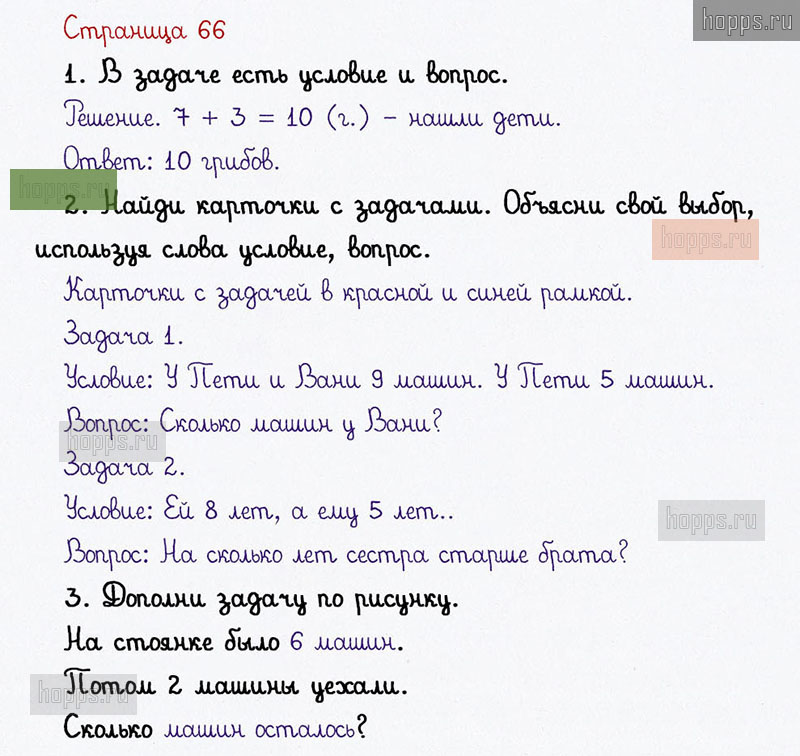 Подробные ответы к заданиям на 66 странице 1 части учебника по математике авторов В. Н. Рудницкая, Е. Э. Кочурова, О. А. Рыдзе для учащихся 1 класса. Урок 28. Знакомимся с задачей.