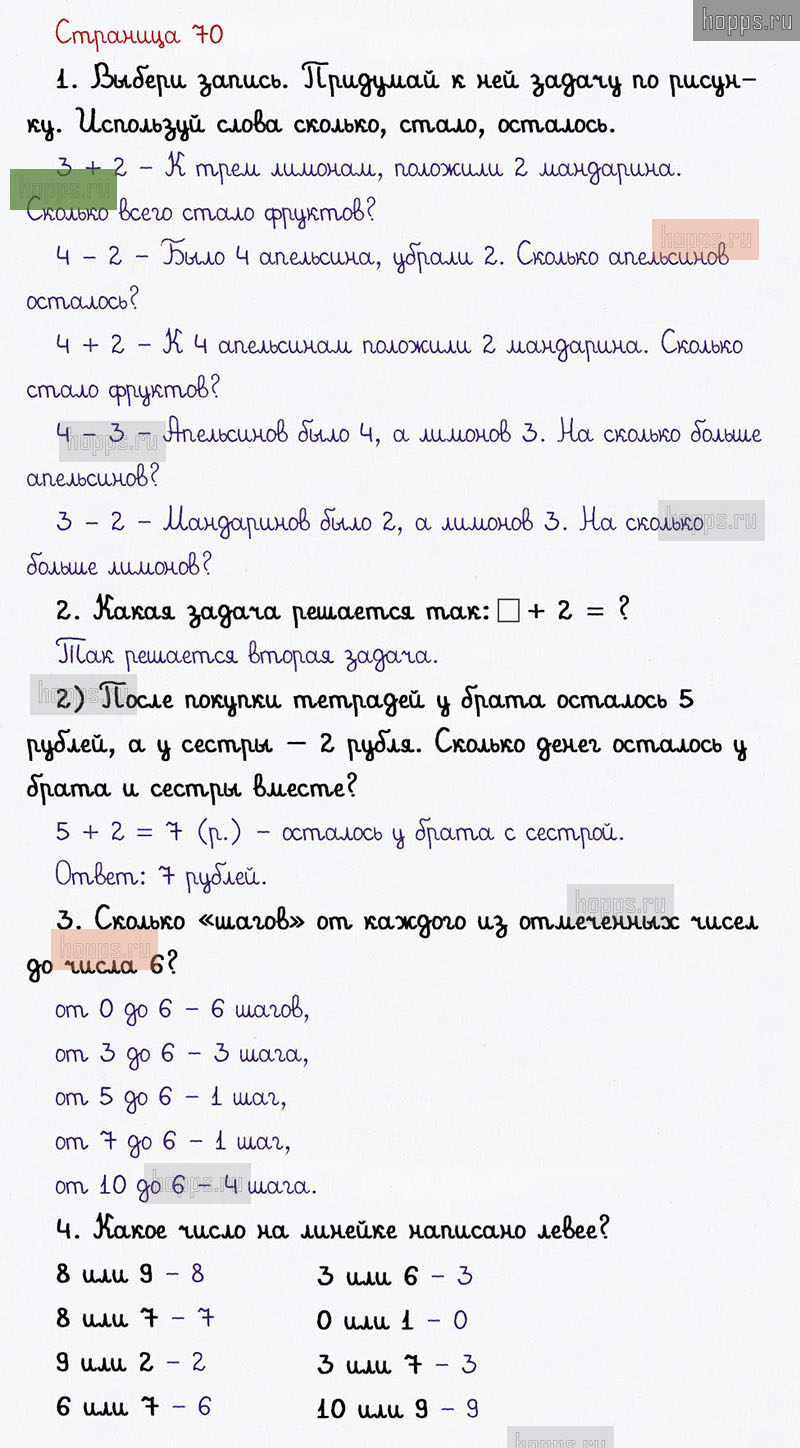 Подробные ответы к заданиям на 70 странице 1 части учебника по математике авторов В. Н. Рудницкая, Е. Э. Кочурова, О. А. Рыдзе для учащихся 1 класса. Урок 30. Решаем задачи.