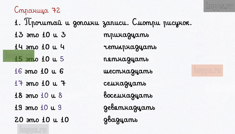 Подробные ответы к заданиям на 72 странице 1 части учебника по математике авторов В. Н. Рудницкая, Е. Э. Кочурова, О. А. Рыдзе для учащихся 1 класса. Урок 31. Знакомимся с числами от 11 до 20.