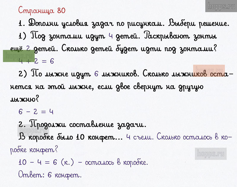 Подробные ответы к заданиям на 80 странице 1 части учебника по математике авторов В. Н. Рудницкая, Е. Э. Кочурова, О. А. Рыдзе для учащихся 1 класса. Урок 34. Составляем задачи.