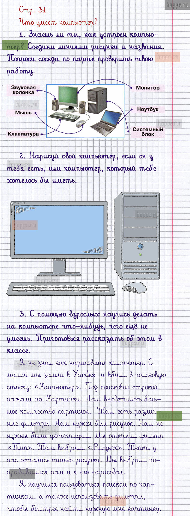 Подробные ответы к заданиям, расположенным на 31 странице 1 части рабочей тетради 2013 года по окружающему миру автора Плешаков А.А. для учащихся 1 класса.