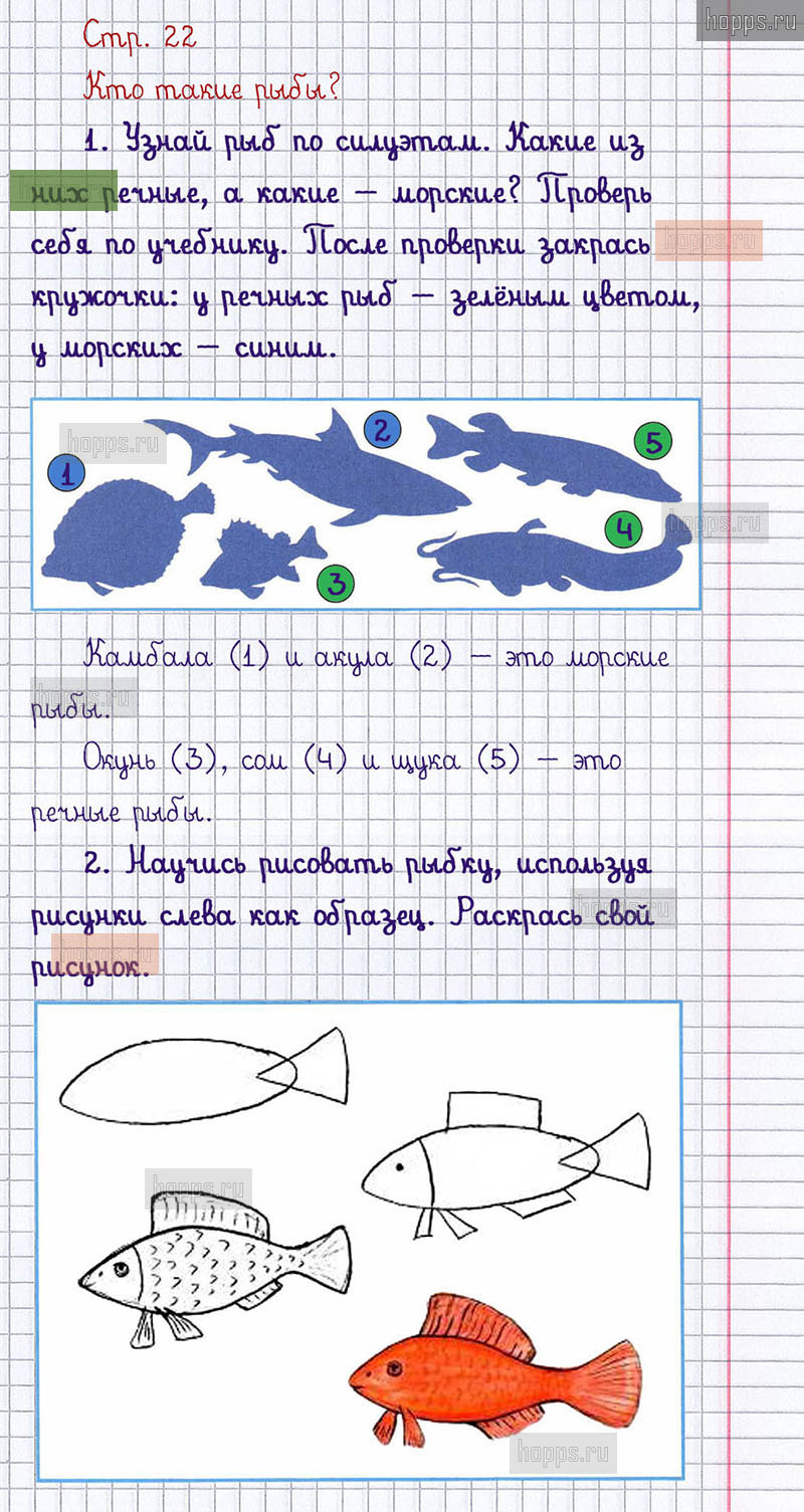 Подробные ответы к заданиям, расположенным на 22 странице 1 части рабочей тетради 2019 года по окружающему миру автора Плешаков А.А. для учащихся 1 класса.