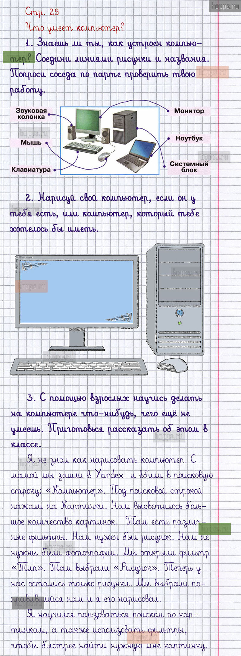 Подробные ответы к заданиям, расположенным на 29 странице 1 части рабочей тетради 2019 года по окружающему миру автора Плешаков А.А. для учащихся 1 класса.