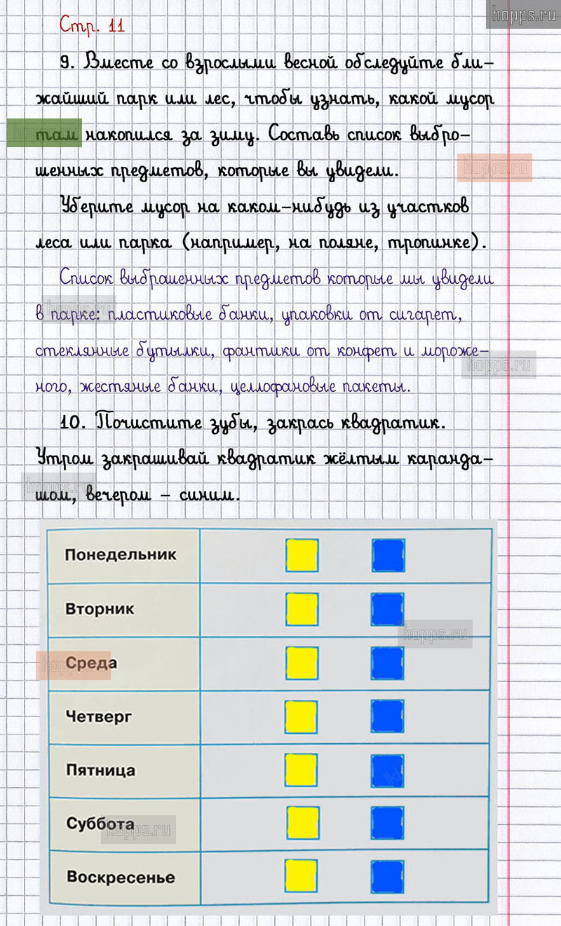 Подробные ответы к заданиям, расположенным на 11 странице научного дневника рабочей тетради по окружающему миру автора Плешаков А.А. для учащихся 1 класса.