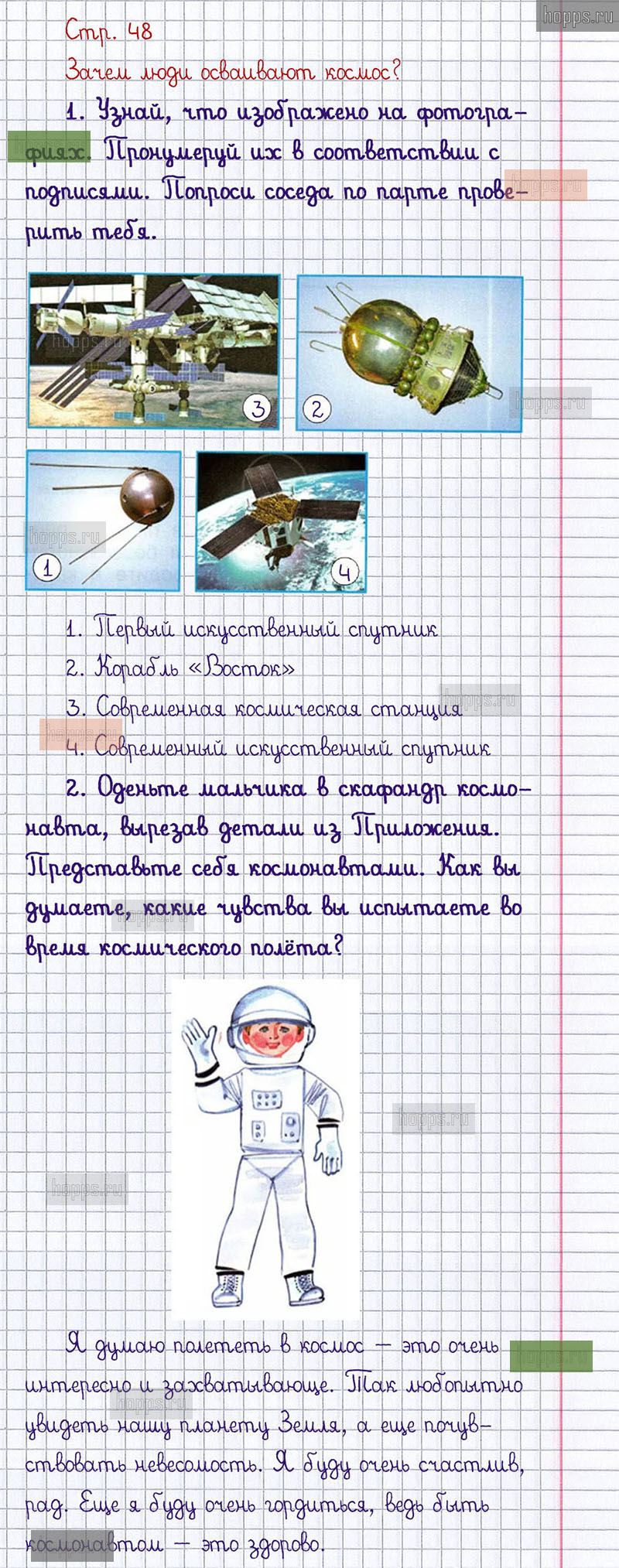 Подробные ответы к заданиям, расположенным на 48 странице 2 части рабочей тетради 2019 года по окружающему миру автора Плешаков А.А. для учащихся 1 класса.