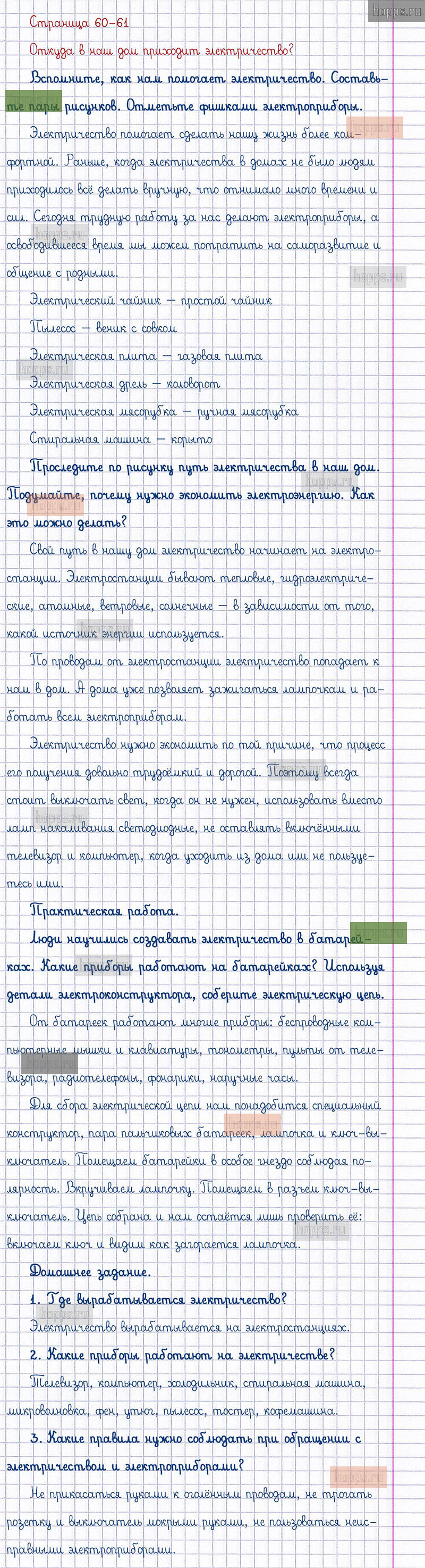 Подробные ответы к заданиям, расположенным на 60-61 странице 1 части учебника по окружающему миру автора Плешаков А.А. для учащихся 1 класса. Откуда в наш дом приходит электричество?