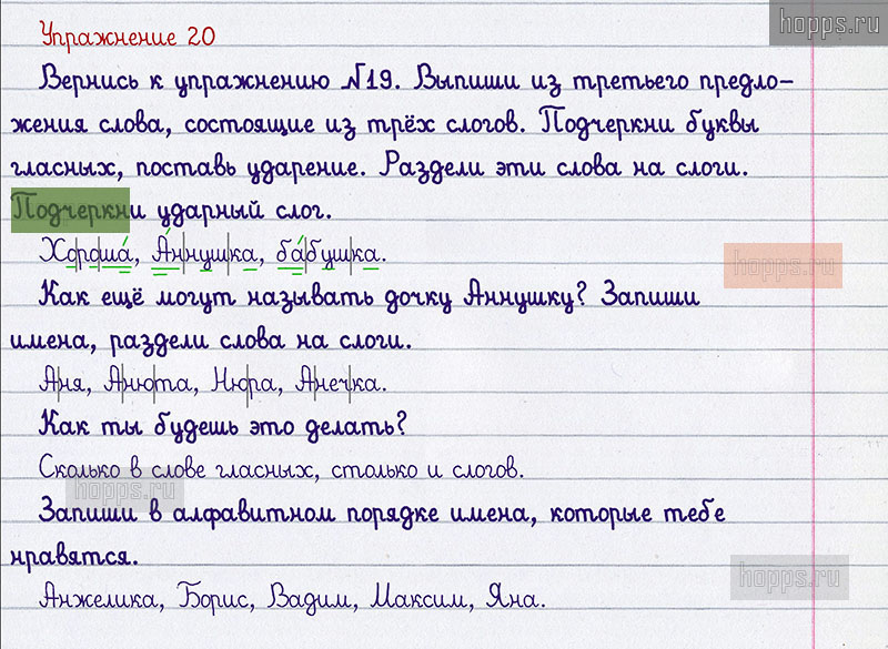 Подробные ответы к 20 заданию учебника по русскому языку авторов Р.Н. Бунеев, Е.В. Бунеева, О.В. Пронина для учащихся 1 класса. §2. Повторяем слоги и ударение.