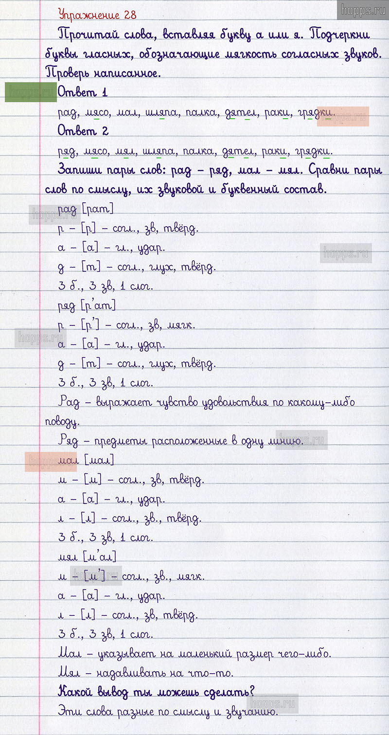 Подробные ответы к 28 заданию учебника по русскому языку авторов Р.Н. Бунеев, Е.В. Бунеева, О.В. Пронина для учащихся 1 класса. §3. Повторяем способы обозначения мягкости согласных звуков на письме.