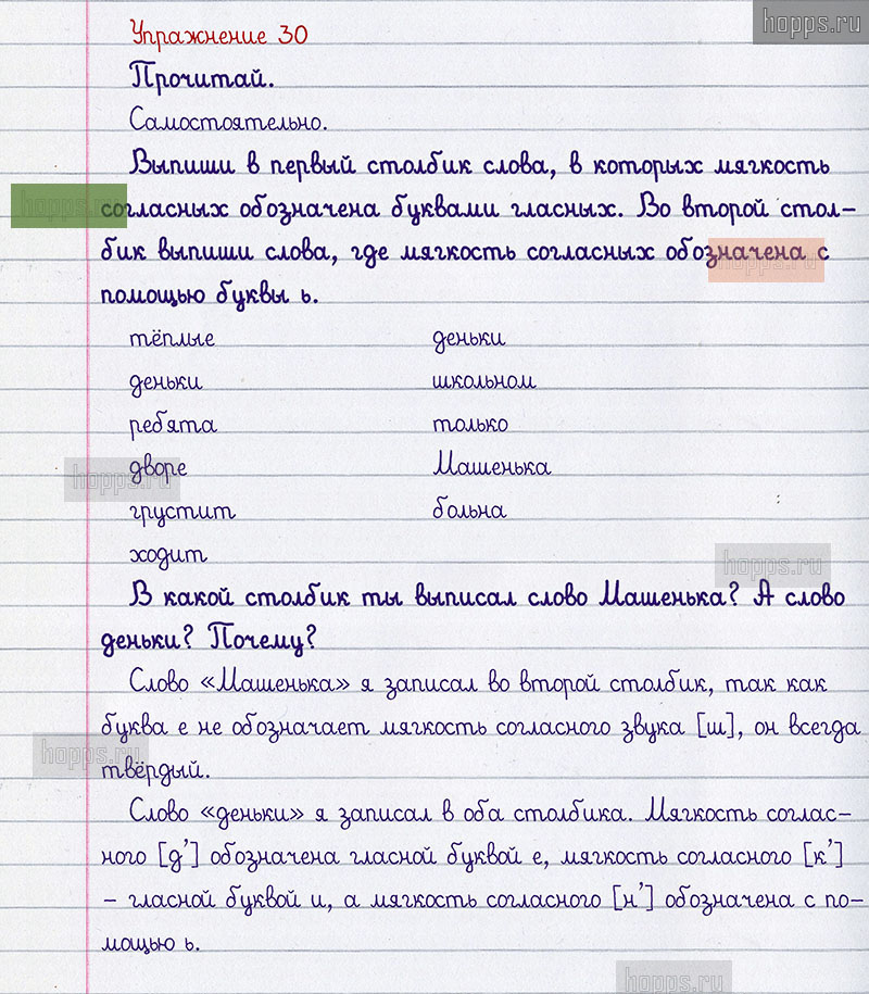 Подробные ответы к 30 заданию учебника по русскому языку авторов Р.Н. Бунеев, Е.В. Бунеева, О.В. Пронина для учащихся 1 класса. §3. Повторяем способы обозначения мягкости согласных звуков на письме.