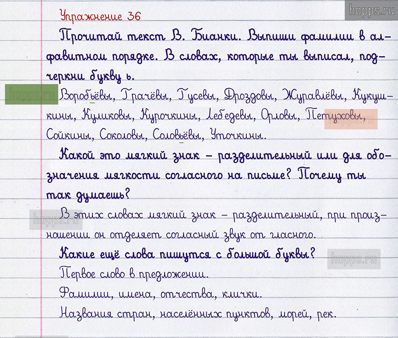 Подробные ответы к 36 заданию учебника по русскому языку авторов Р.Н. Бунеев, Е.В. Бунеева, О.В. Пронина для учащихся 1 класса. §4. Повторяем написание большой буквы и разделительного Ь в словах.