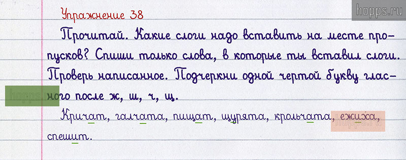 Подробные ответы к 38 заданию учебника по русскому языку авторов Р.Н. Бунеев, Е.В. Бунеева, О.В. Пронина для учащихся 1 класса. §5. Повторяем написание жи-ши, ча-ща, чу-щу, чк, чн в словах.